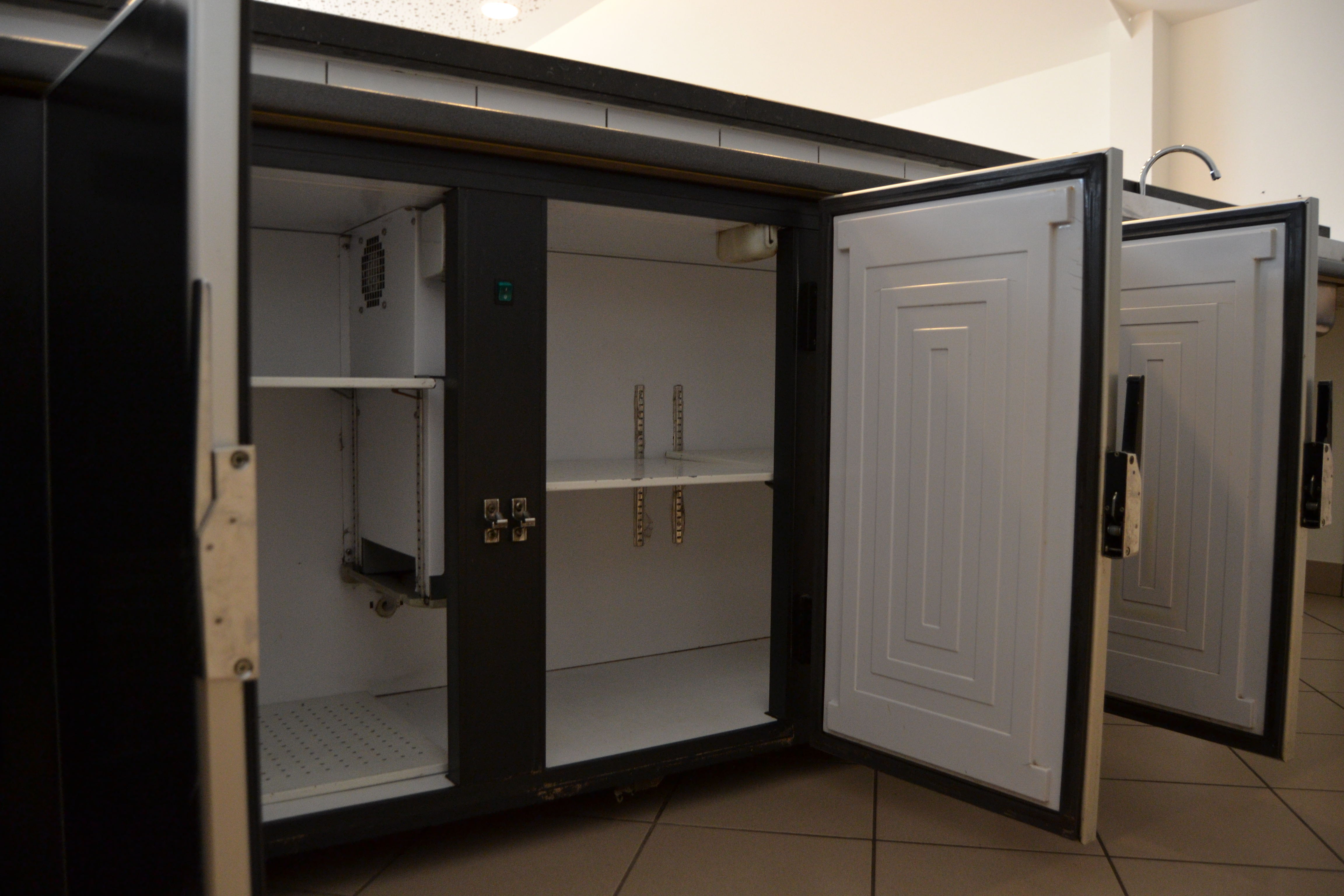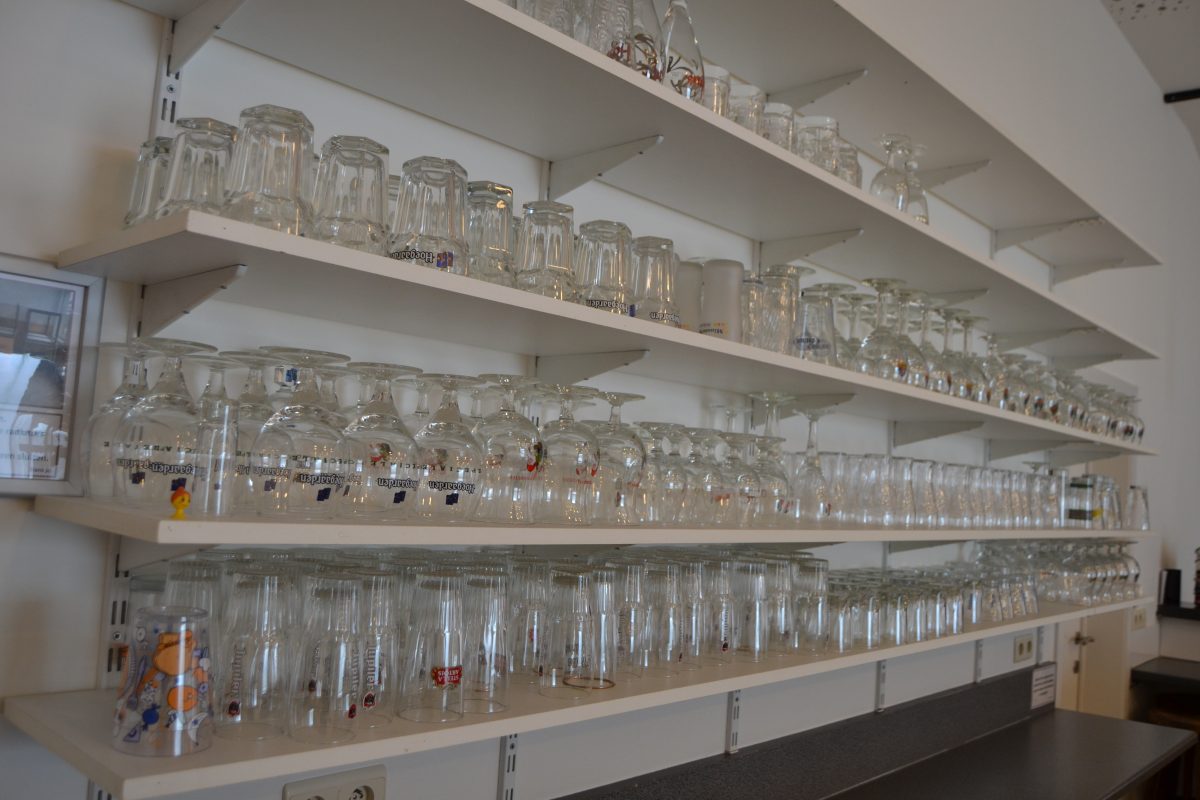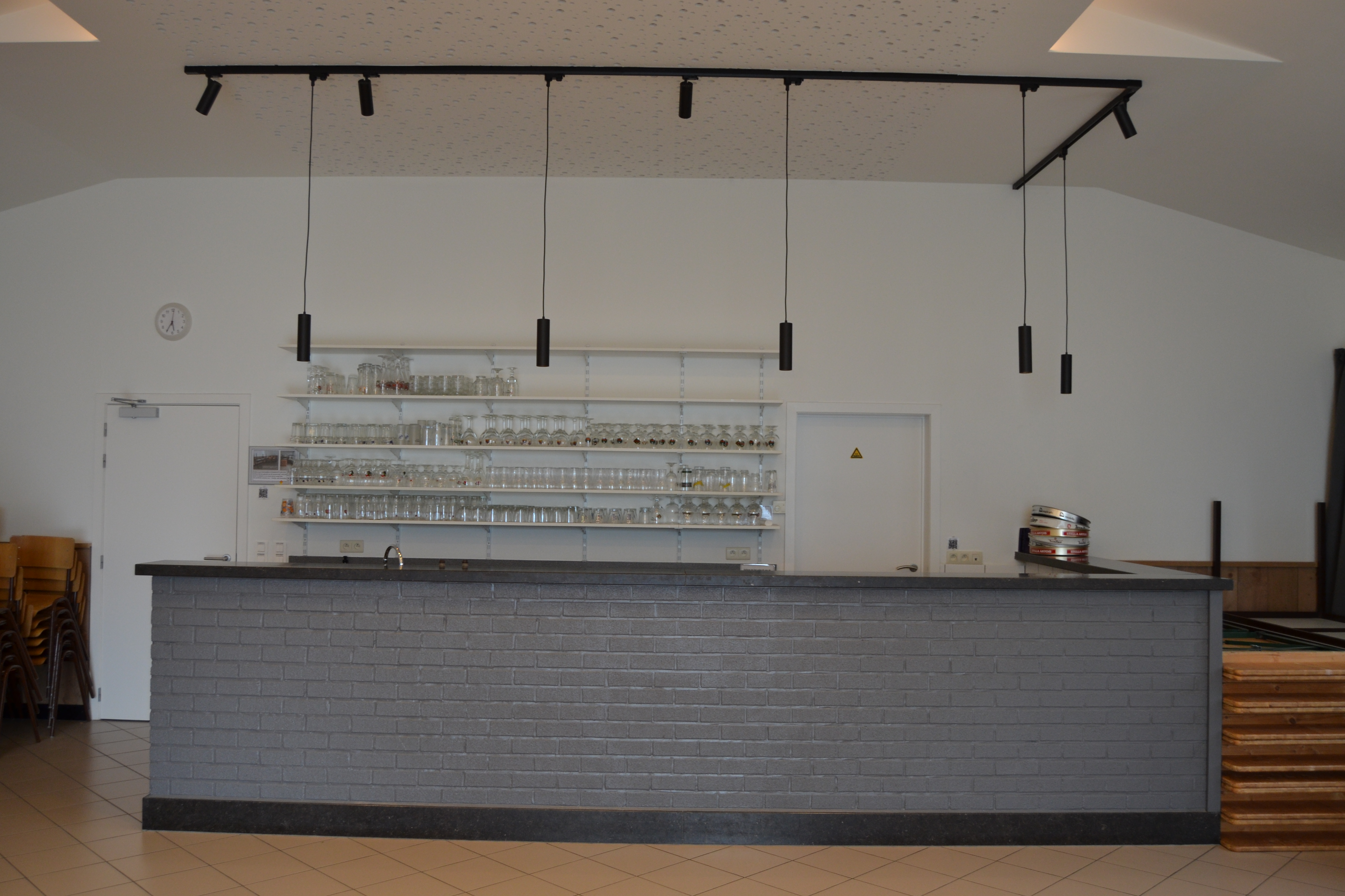 In de grote zaal staat een lange verlichte toog, uitgerust met 3 frigo’s voor drank en een dubbele wasbak met borstels. Achter de toog kan je een uitgebreid assortiment glazen terugvinden. Plateau’s voor drank zijn beschikbaar.