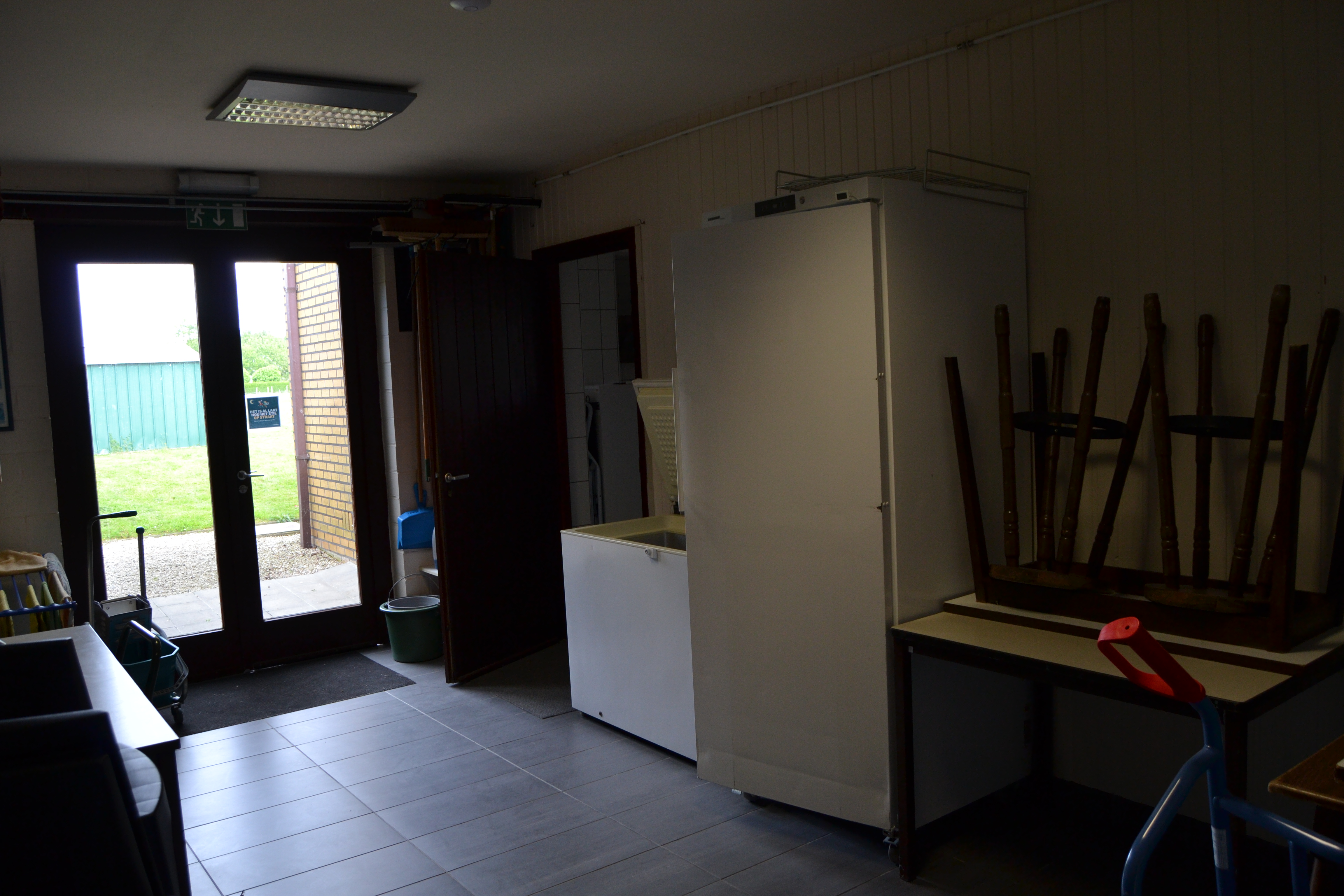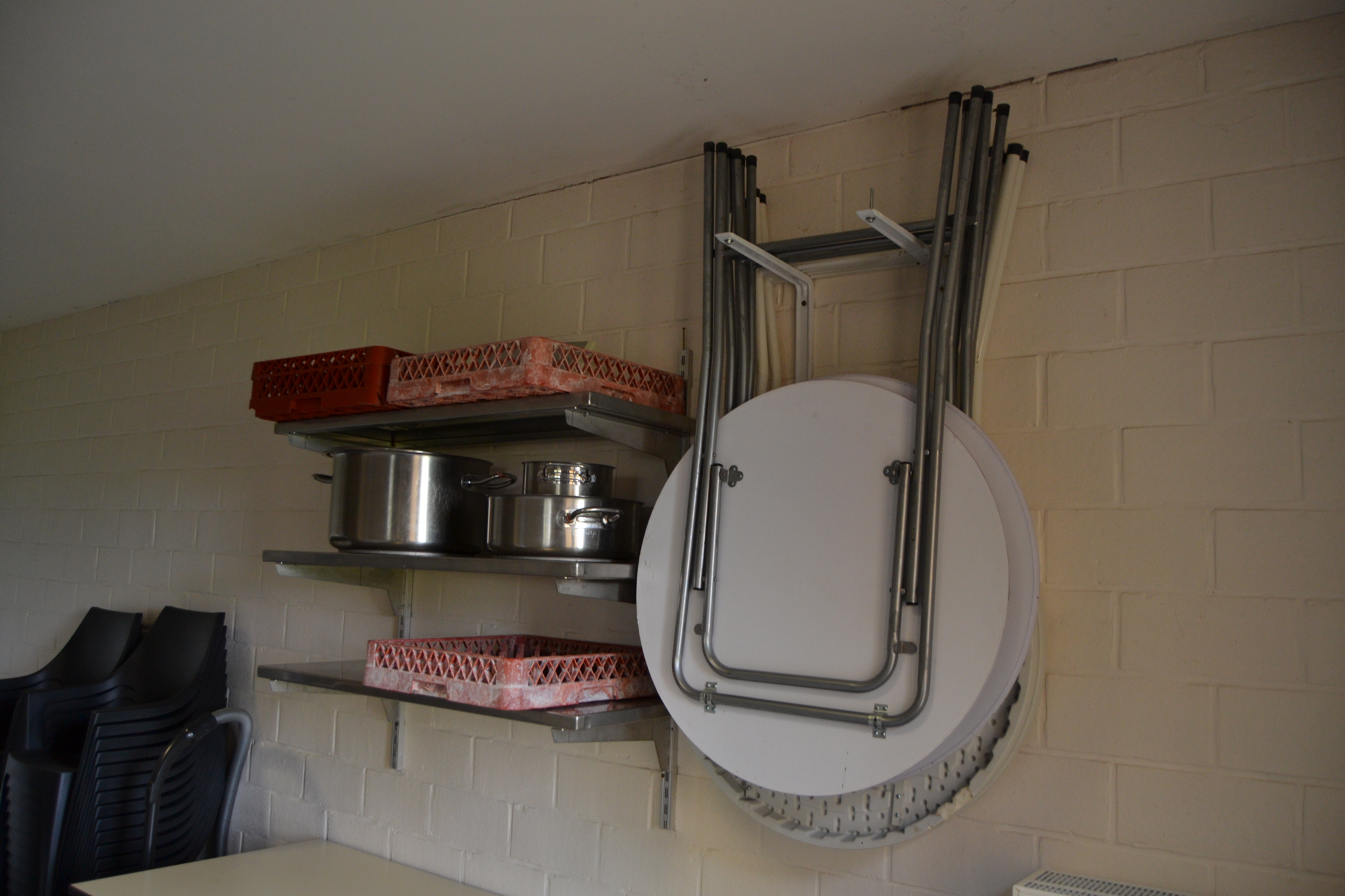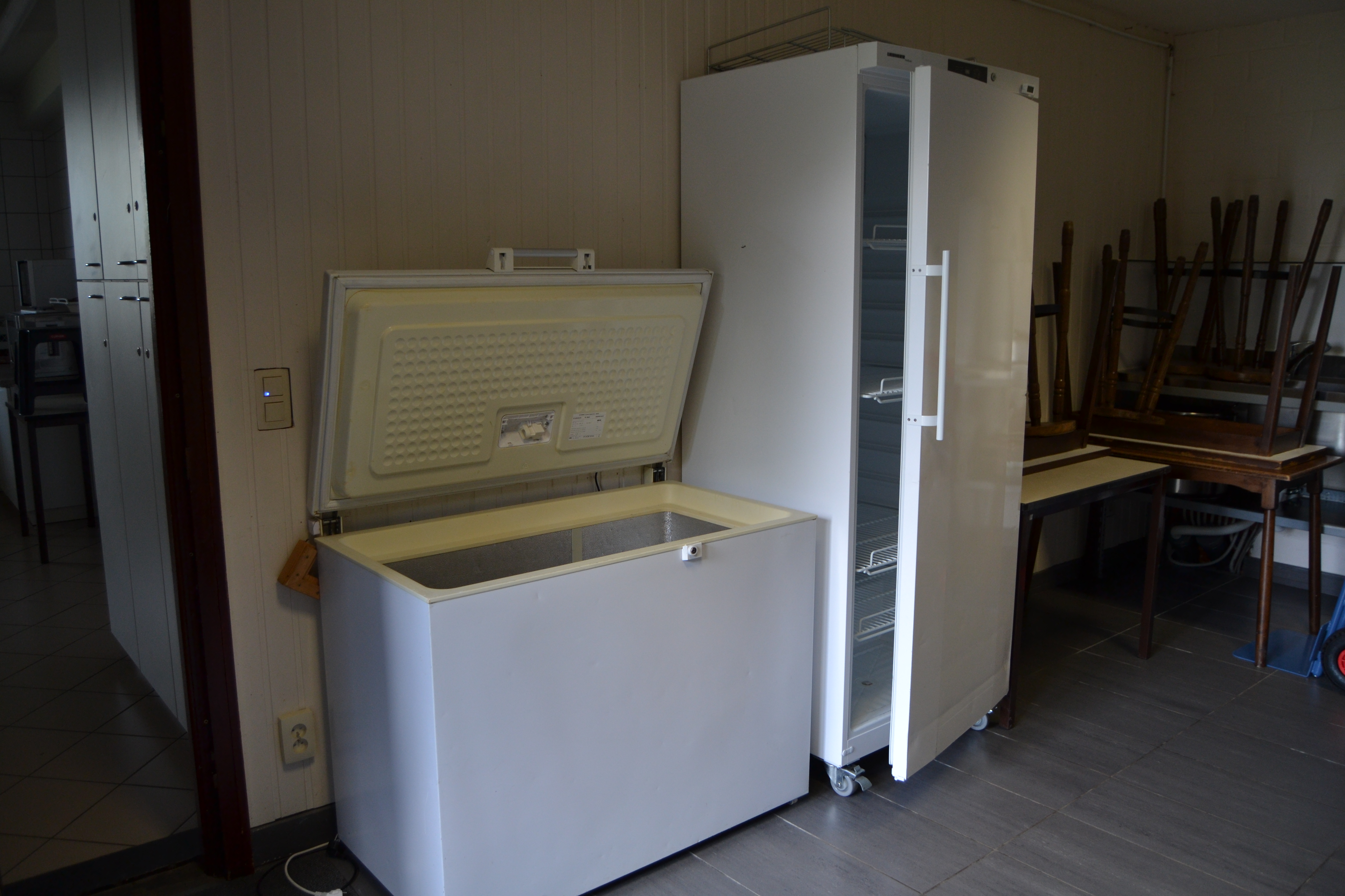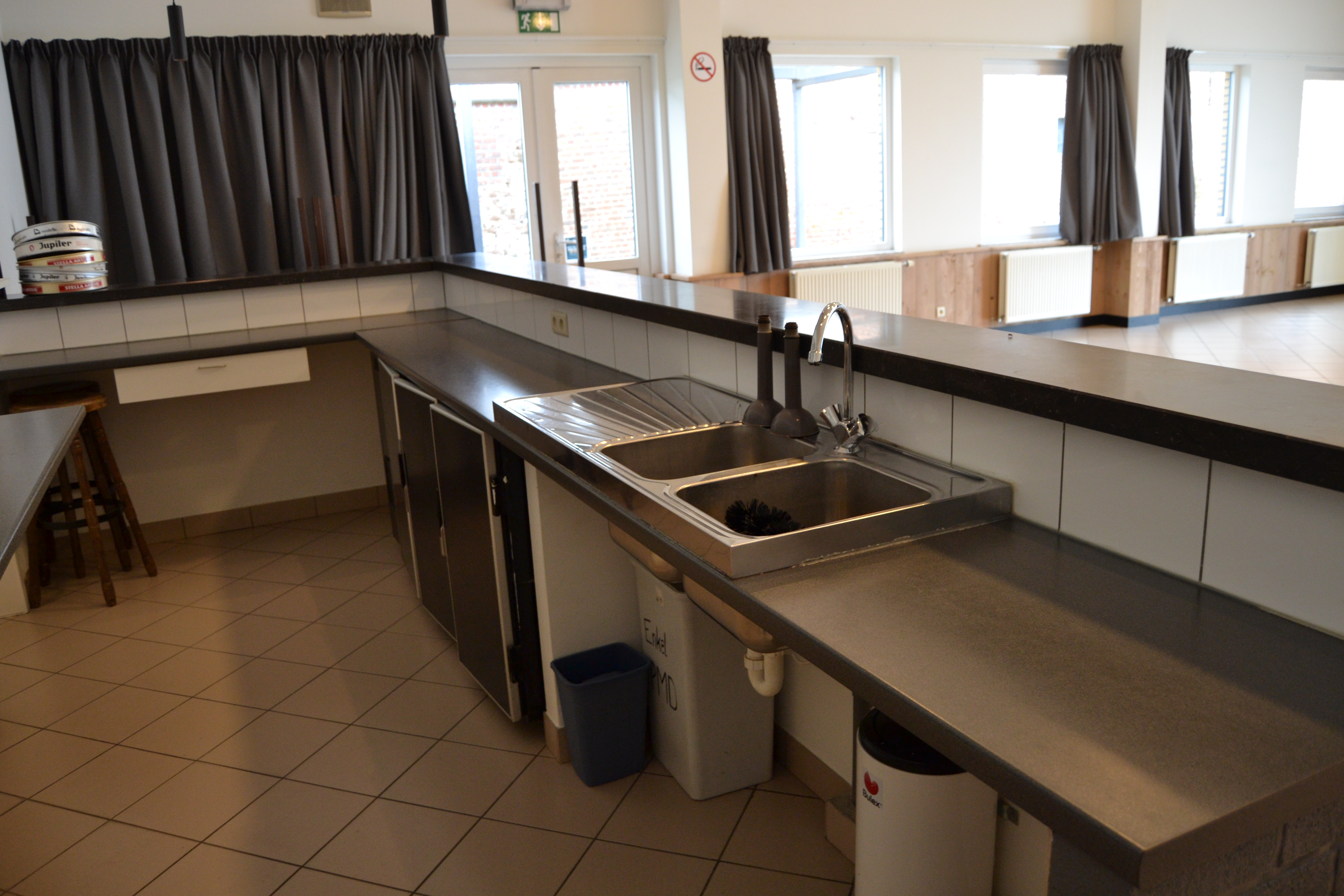 In de bijkeuken kan je heel wat bijkomend materiaal terugvinden, zoals het kuisgerief, een grote vriezer en frigo, de barkrukken, de partytafels en de stoelen voor buiten. Ook is er een extra wastafel beschikbaar.